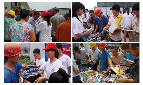 7月20日, iqqtv 大学生暑期社会实践“关爱农民工”志愿服务队在院团委老师的带领下,来到“建业公园里”建筑工地为农民工免费发放书籍和衣物,本次所发放物品均来自社会各界爱心人士的捐赠。