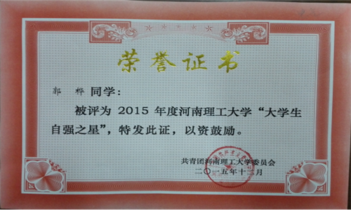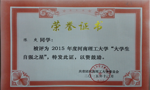 2015年度寻访“中国大学生自强之星”活动是由共青团中央、全国学联举办,以“青春自强?励志华章—我为构建清朗网络空间代言”为主题,旨在通过这一活动,在当代大学生中树立一批可亲、可敬、可信、可学的榜样,进一步培育和践行社会主义核心价值观。按照共青团河南省委、河南省学生联合会的要求和工作安排,校团委以“中国大学生自强之星”及河南省“大学生自强之星”寻访活动为契机,举办了校级寻访“大学生自强之星”活动,经过各阶段的评选,共选出10名同学为2015年度 iqqtv “大学生自强之星”。
