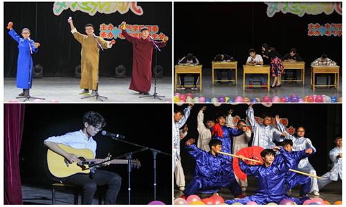伴随着强劲的鼓声,在同学们的高喊声中,一片清脆的竹板声拉开了晚会的帷幕。歌舞、小品、视频、乐器联奏等精彩的节目为观众呈现了一场丰盛的视听盛宴。来自大学生艺术团的李明霞演唱的《喜欢你》嘹亮动人、声动梁尘,赢得观众的阵阵掌声;15级学生自导自演的小品《监考老师》幽默搞笑中不失温情和感动,体现出人民教师对学生的淳淳教导之情。晚会中场的抽奖环节带动了全场气氛,一个个搞怪奖品让人忍俊不禁。由16级辅导员及15、16级学生带来的歌曲串烧《80、90秀》将晚会推向了高潮,一首首经典歌曲,勾起观众的无限回忆。其中,16级辅导员李伟伟老师一曲《上海滩》更是引爆全场,让同学们看到了老师们隐藏在严肃的外表下的可爱一面。最后,晚会在一曲《鸿雁》中落下了帷幕。
