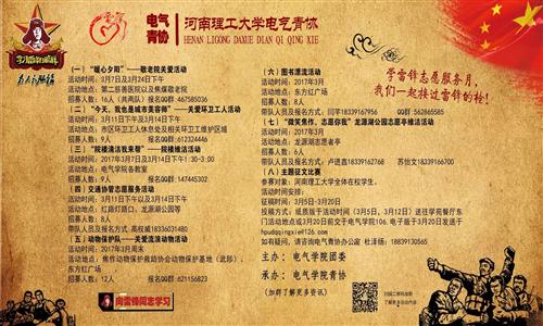 今年3月5日是全国第54个学雷锋纪念日,也是第17个中国青年志愿者服务日。为进一步弘扬和传承雷锋精神,加强学生思想道德教育,由 iqqtv团委主办,院青年志愿者协会承办的“学雷锋志愿者服务月”系列活动将于3月5日正式开始。