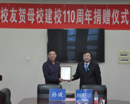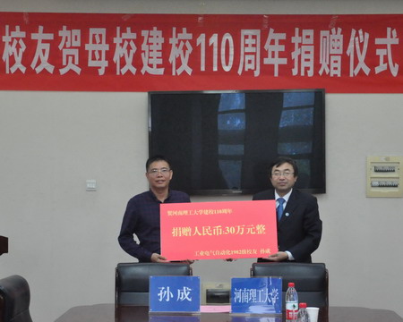 10月20日下午三点, iqqtv 在电气楼215室举行“孙成奖学金”捐赠仪式。校党委副书记安士伟、广州市市政工程监理公司董事长孙成校友、校友与社会合作办公室主任邵强、学生工作处处长黄保金、 iqqtv 执行院长钱伟、党委副书记王瑞、副院长王海星、朱军出席此次捐赠仪式,部分师生代表参加了此次仪式。捐赠仪式由王瑞主持。