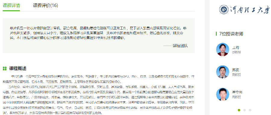 该课程于2017年3月获批 iqqtv 在线开放课程立项, 2018年10月开始在学校云平台以SPOC方式运行,2019年10月获批为河南省精品在线开放课程。课程采用“项目驱动”与“虚拟实验”相结合的教学模式,每一学习模块均安排有基于Proteus的仿真实例,学生无需借助实验箱、仿真器和开发板就可以在纯软件环境下完成应用系统的设计与调试。课程通过精心设计的学习路线帮助学生掌握单片机应用系统开发必备的软硬件知识与技能,为工程应用和进一步学习ARM、DSP等嵌入式技术奠定基础。